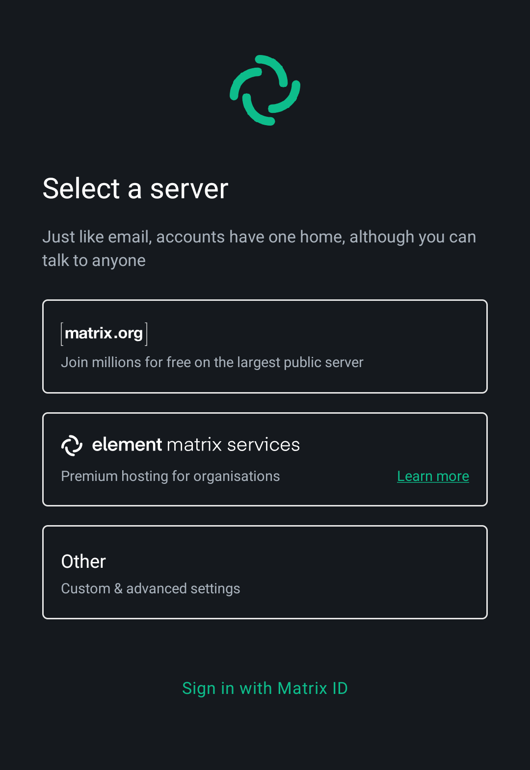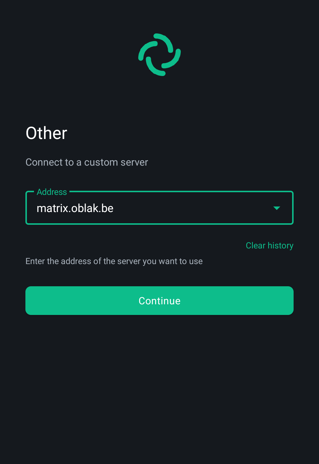 Fill in the server address, matrix.oblak.be, then tap continue.